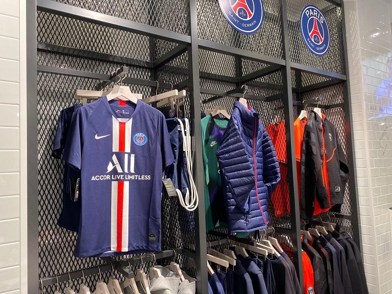 パリ・サン=ジェルマンストア シブヤ・パルコは大きく分けて3つのカテゴリーに分かれている。ユニフォームなどのサッカーアイテム、タウンユースに使いやすいライフスタイル、そして黒を基調としたアイテムが目を引くグッズである。